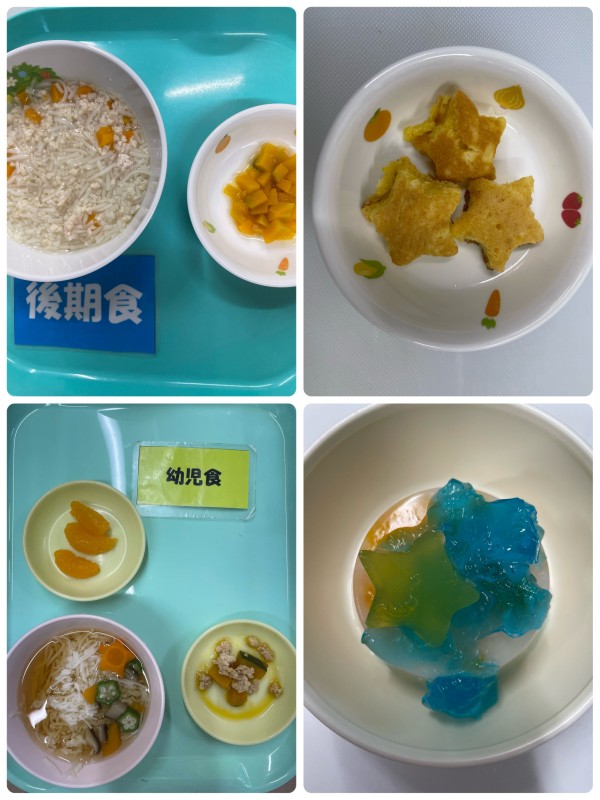 七夕にゅうめん、かぼちゃの煮物 後期おやつ 星型かぼちゃケーキ 幼児食 七夕そうめん、かぼちゃのそぼろ煮、みかん缶 15時のおやつ 七夕ゼリー
