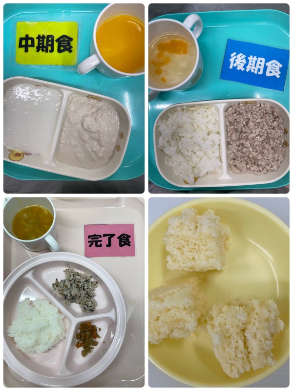 中期 7倍粥、鶏そぼろ煮、みそ汁 後期 軟飯、豚そぼろ煮、みそ汁 15時のおやつ 蒸しパン 完了期 ご飯、和風ハンバーグ、きんぴらごぼう、みそ汁 15時のおやつ 蒸しパン