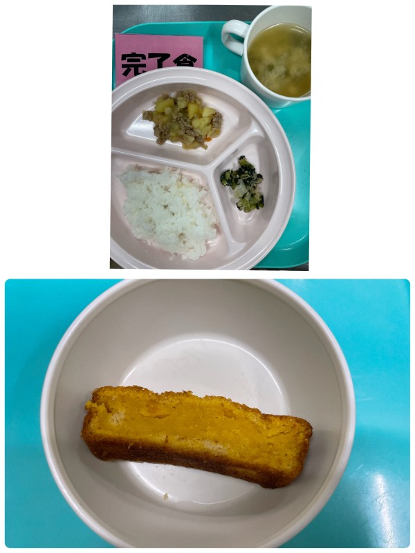 ご飯、肉じゃが、小松菜とキャベツのツナ和え、豆腐みそ汁 15時のおやつ ケーキ・かぼちゃ
