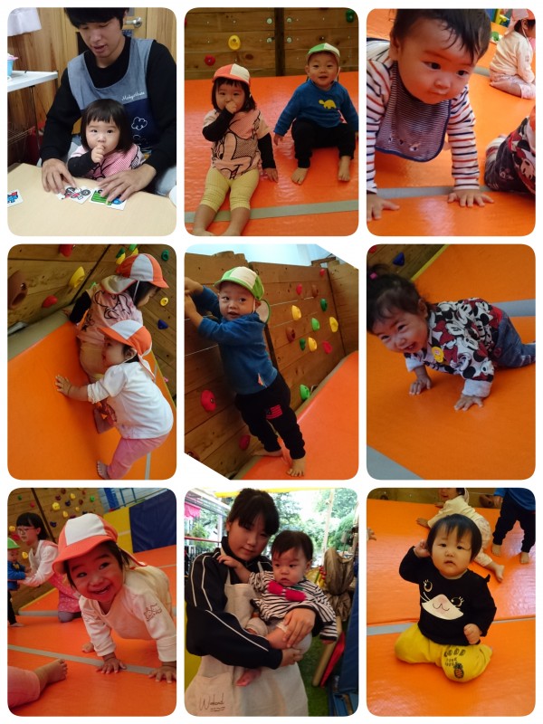 今日も、芝生のマットで遊びました。マットへ出るなり「キャー❗」と はしゃぐ子ども達です。1人が坂を上ると、後に続けと他の子ども達も上っていました。足腰がしっかりしてきて、みんなで楽しめるようになりました。