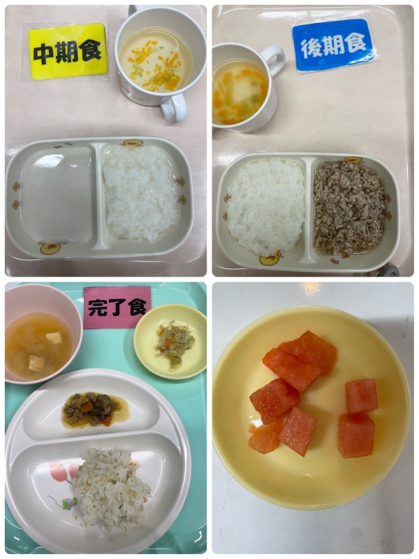 中期 7倍粥、鶏そぼろ煮、みそ汁 後期 軟飯、豚そぼろ煮、みそ汁 15時のおやつ すいか 完了期 軟飯、豚肉と野菜のカレー炒め、キャベツとじゃこの和え物、みそ汁 15時のおやつ すいか、せんべい