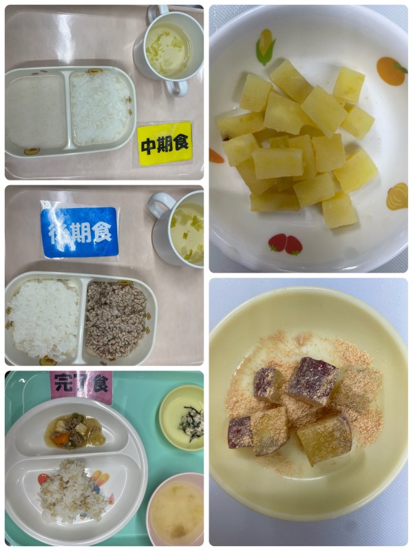 中期 7倍粥、鶏そぼろ煮、スープ 後期 軟飯、豚そぼろ煮、スープ 15時のおやつ 蒸しいも 完了期 軟飯、厚揚げの中華煮、ほうれん草と豆腐のごま和え、春雨スープ 15時のおやつ きな粉ポテト
