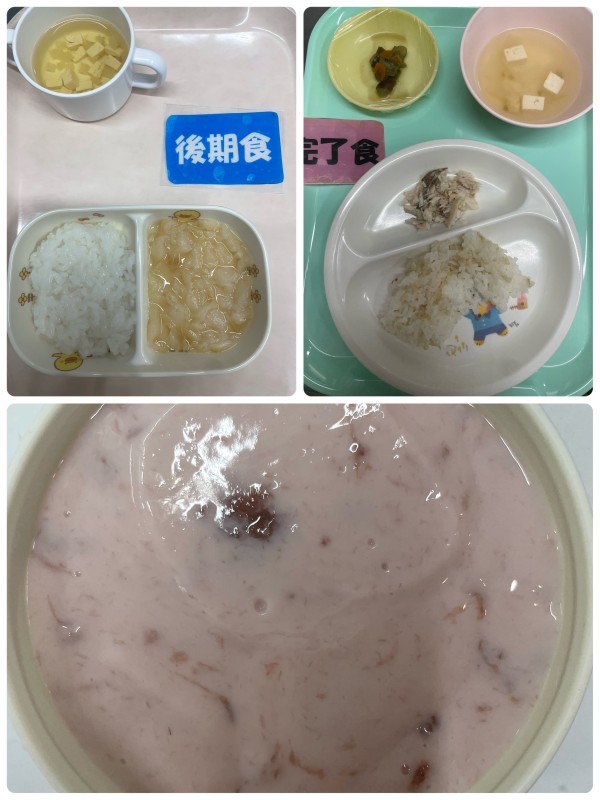 後期 軟飯、白身魚の煮付け、すまし汁 15時のおやつ ウエハース 完了期 軟飯、魚の塩焼き、ナスの味噌炒め、豆腐すまし汁 15時のおやつ フルーチェ