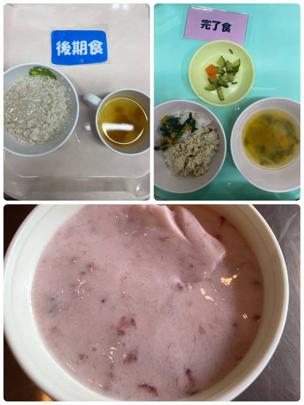 後期 鶏そぼろおじや、みそ汁 15時のおやつ ウエハース 完了期 三色そぼろ丼、きゅうりの昆布和え、みそ汁 15時のおやつ フルーチェ