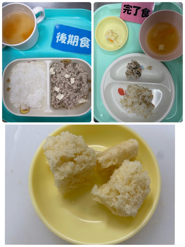 後期 7倍粥、豚と豆腐のそぼろ煮、みそ汁 完了期 ご飯、ミートローフ、コールスローサラダ、みそ汁 15時のおやつ 蒸しパン