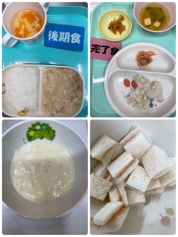 後期 7倍粥、白身魚の煮付け、みそ汁 15時のおやつ パン粥 完了期 軟飯、鮭の塩焼き、切り干し大根の甘煮、みそ汁 15時のおやつ ジャムサンド