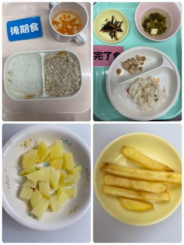 後期 5倍粥、鶏そぼろ煮、豆腐すまし汁 15時のおやつ ポテト 完了期 軟飯、鶏肉のカレー焼き、ひじきの煮物、豆腐すまし汁 15時のおやつ フライドポテト🍟