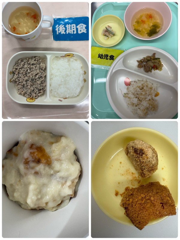 後期 5倍粥、豚そぼろ煮、すまし汁 15時のおやつ パン粥 幼児食 ご飯、豚肉と野菜の味噌炒め、大根の和え物、すまし汁 15時のおやつ あげパン