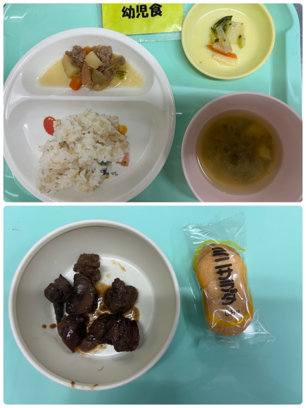 後期 軟飯、豚と芋の煮物、みそ汁 15時のおやつ ウエハース 完了食 ご飯、肉じゃが、大根の酢和え、みそ汁 15時のおやつ 鶏レバーの甘辛煮、せんべい