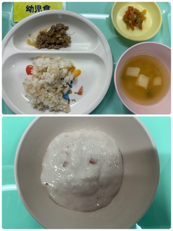 ご飯、豚肉の生姜焼き、切り干し大根の旨煮、みそ汁 15時のおやつ フルーチェ