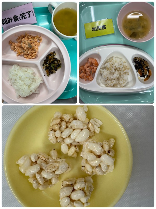 ご飯、鮭の塩焼き、ひじきの煮物、みそ汁 15時のおやつ ポン菓子バー