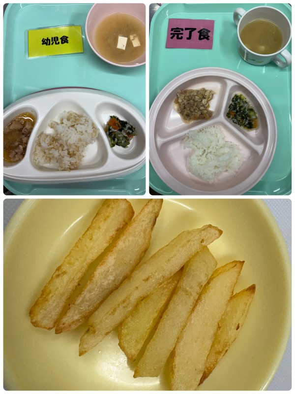 ご飯、鶏のおろし煮、きゅうりの酢の物、みそ汁 15時のおやつ フライドポテト