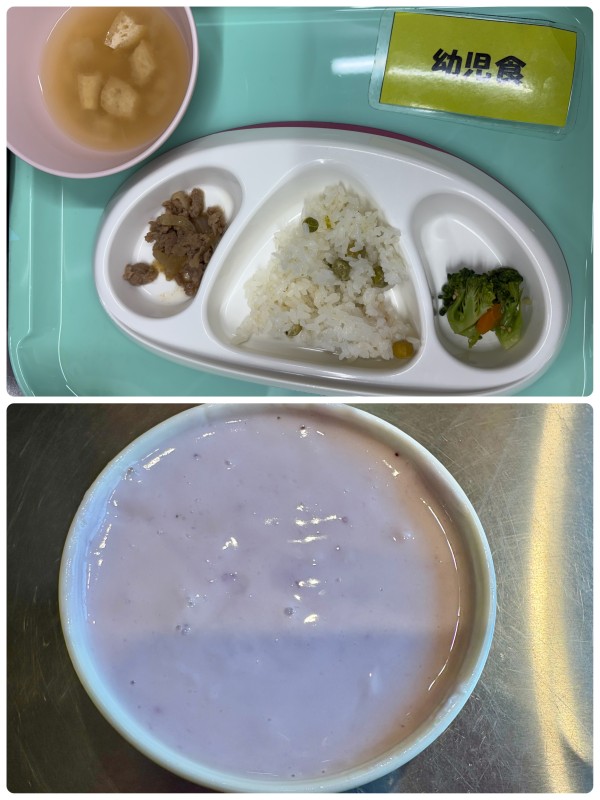 豆ご飯、豚の生姜焼き、ブロッコリーのごま和え、みそ汁 15時のおやつ ヨーグルト(ブルーベリー🫐)
