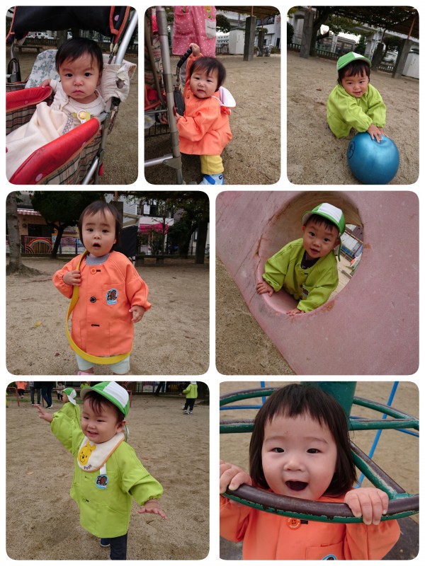 外へ出ると、「歩きたい‼️」と子ども達。元気いっぱい公園を駆け回っています。公園から保育園までの道のりを、りす組さんに手を繋いでもらって帰ることもあります。りす組さんは、ちょっと誇らしげに、ひよこ組さんは嬉しそうに歩いています。