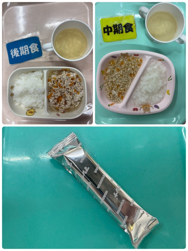 中期 7倍粥、鶏とにんじんの煮物、玉ねぎ汁 後期 5倍粥、鶏とにんじんの煮物、玉ねぎ汁 15時のおやつ ウエハース