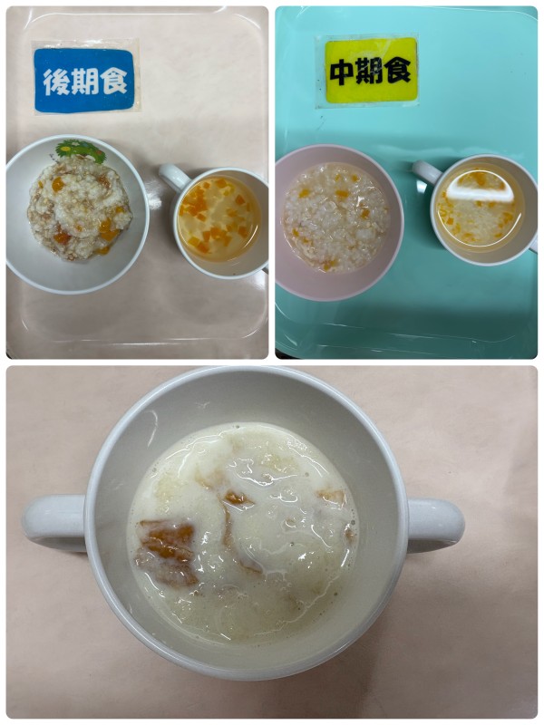 中期 夏野菜と鶏のおじや、スープ 後期 夏野菜と豚のおじや、スープ 15時のおやつ パン粥
