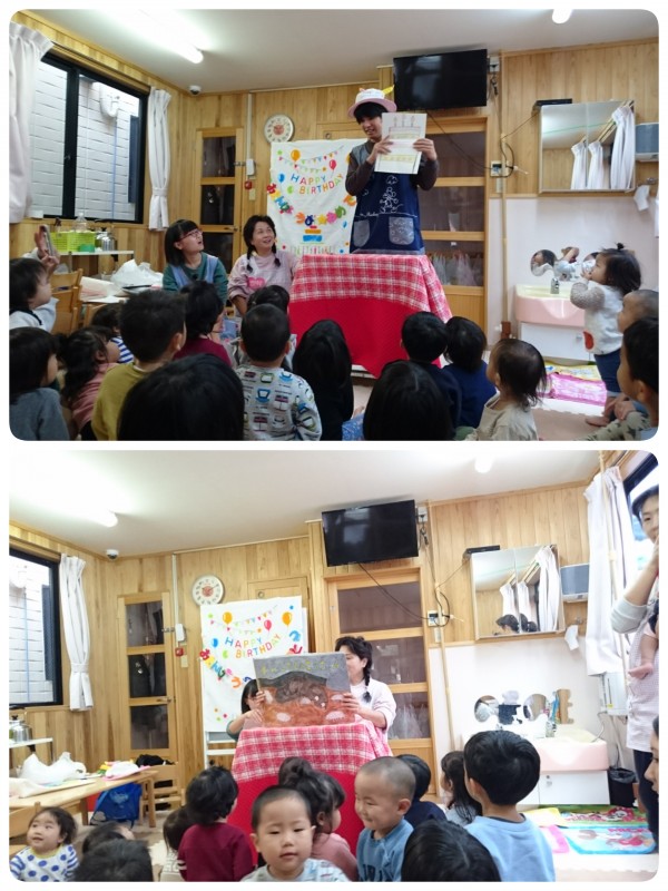 今日は、11月生まれのお誕生日会でした。保育士の出し物 手品や紙芝居、手遊びを見ました。「アブラカタブラ➰🎵」と呪文を唱えると…ケーキやお花が出てきてビックリ‼️ その後の紙芝居では、だんごむしのお話でした。最後は、カミナリどんの手遊びで盛り上がり、楽しい誕生日会となりました。