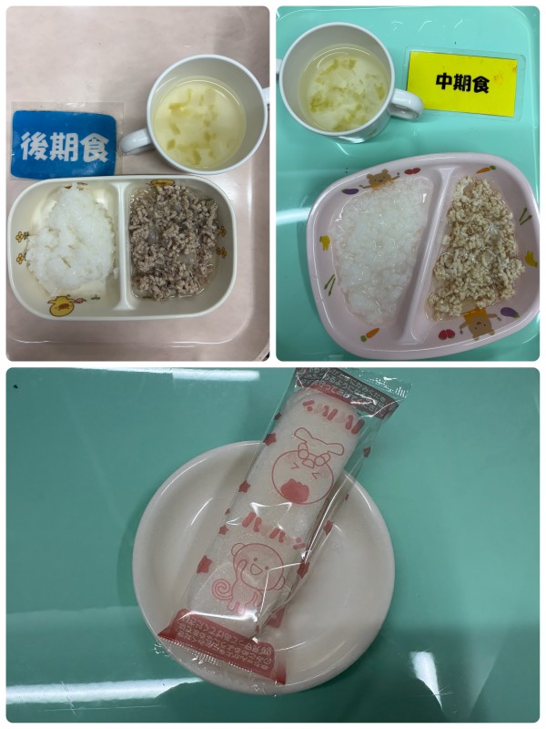 中期 5倍粥、鶏と玉ねぎの煮物、みそ汁 後期 7倍粥、豚と玉ねぎの煮物、みそ汁 15時のおやつ ハイハイン