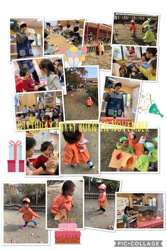 今日は11月生まれのお友達のお誕生日会でした。先生のマジックや紙芝居、手遊びをしてみんなでお祝いしました。お歌もとても上手に歌うことができ、楽しいお誕生日会ができました😊お外では、落ち葉やどんぐりを拾いをしました。画用紙にペタペタくっつけて遊びました。公園には綺麗な落ち葉がいっぱいでした。🍂