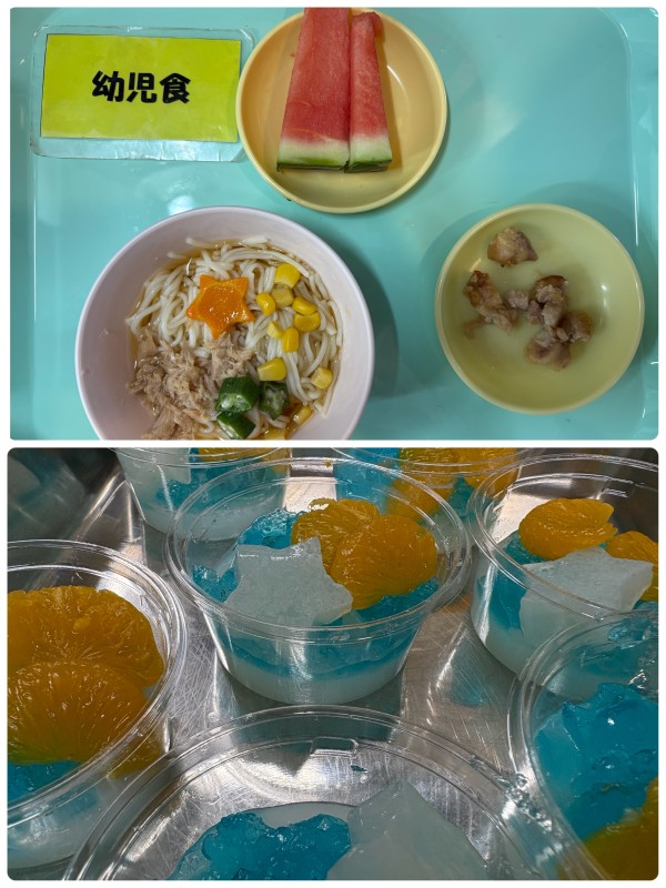 七夕そうめん、鶏肉の照り焼き、すいか 15時のおやつ 七夕ゼリー🎋