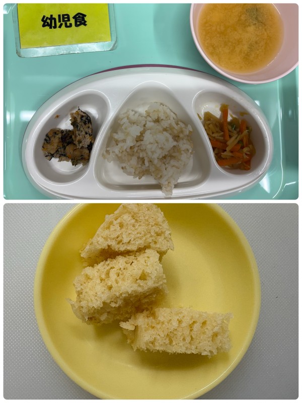 ご飯、和風ハンバーグ、きんぴらごぼう、五目みそ汁 15時のおやつ 蒸しパン