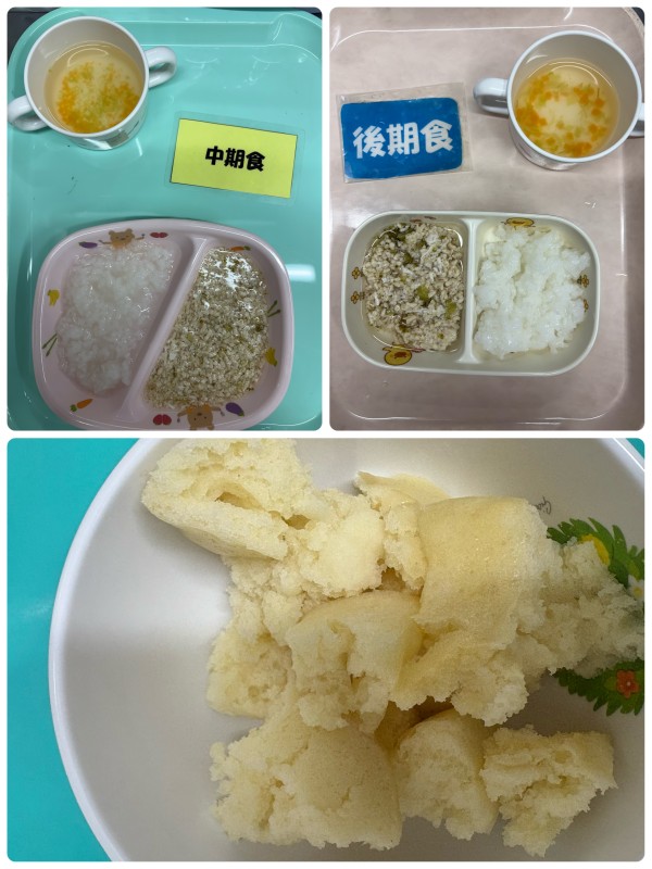 中期 7倍粥、鶏とブロッコリーのそぼろ煮、みそ汁 後期 5倍粥、鳥とブロッコリーのそぼろ煮、みそ汁 15時のおやつ 蒸しパン