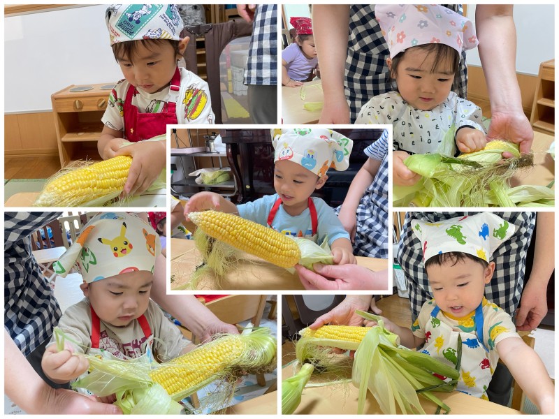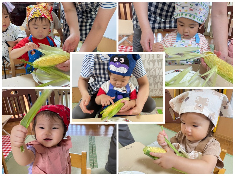 (★2ページあり)今日はクッキングでとうもろこしの皮剥きをしました❕力強く皮を引っ張ったり、慎重にそーっと剥いたり、剥けた皮を嬉しそうに見せてくれたり、それぞれの剥き方で楽しむ子どもたち💭今日のおやつが楽しみだね🌽