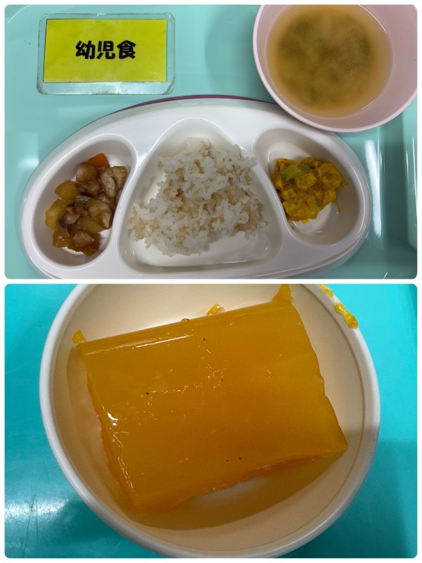 ごはん、鶏の甘酢煮、かぼちゃサラダ、みそ汁 15時のおやつ オレンジゼリー