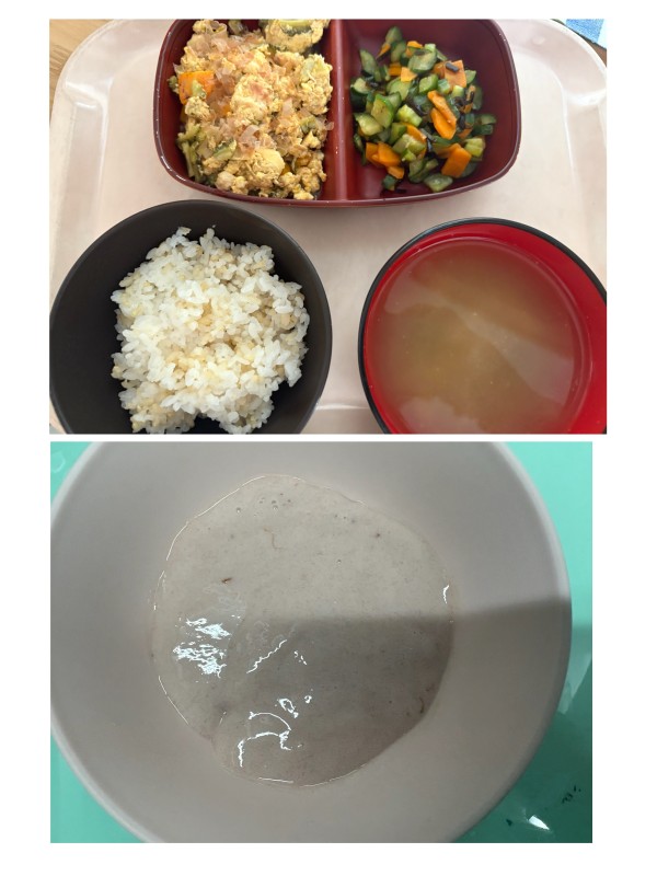 ご飯、ゴーヤチャンプル、きゅうりの昆布和え、みそ汁 15時のおやつ フルーチェ (写真の給食は大人の量です)