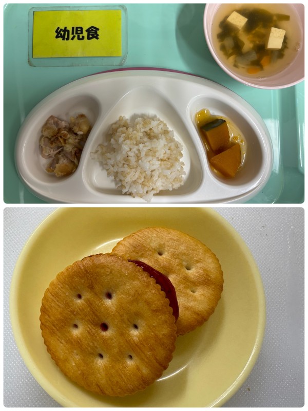 ご飯、鶏の磯辺揚げ、かぼちゃの煮物、豆腐すまし汁 15時のおやつ クラッカーサンド