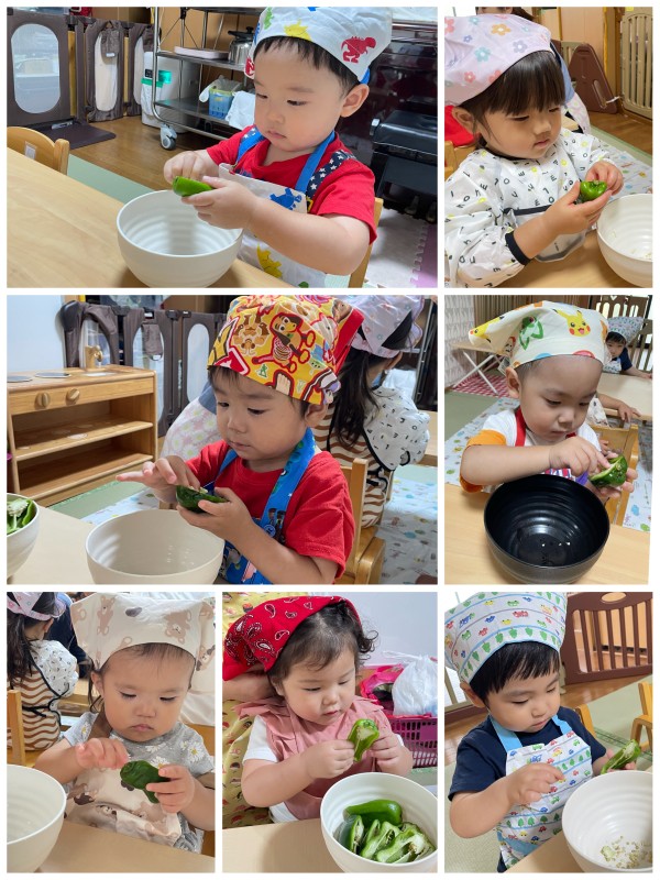 今日はクッキングでピーマンの種取りをしました❕真剣な表情で取り組むうさぎ組さん、一粒ずつ丁寧に種を取って楽しんでいましたよ🫑