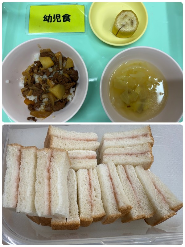 ハヤシライス、スープ、バナナ おやつ いちごジャムサンド