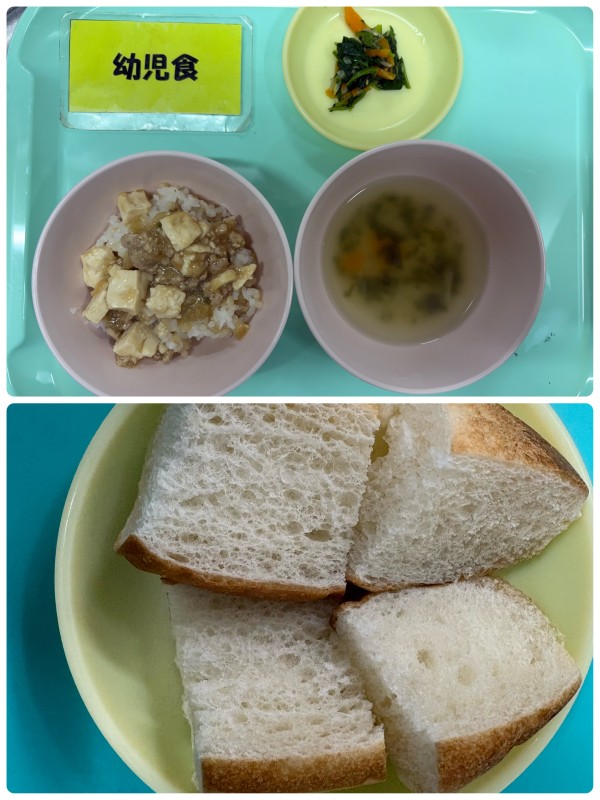 マーボー豆腐丼、ほうれん草のナムル、ワンタンスープ 15時のおやつ パン