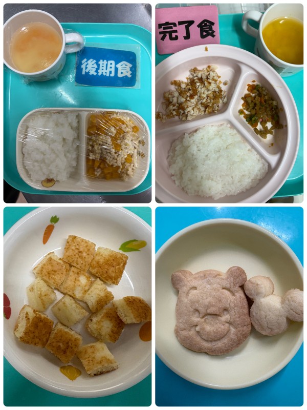 後期 5倍粥、鶏とカボチャのそぼろ煮、みそ汁 15時のおやつ ホットケーキ 完了食 軟飯、鶏の唐揚げ、きんぴらごぼう、みそ汁 15時のおやつ クッキー(プーさんとミッキー)