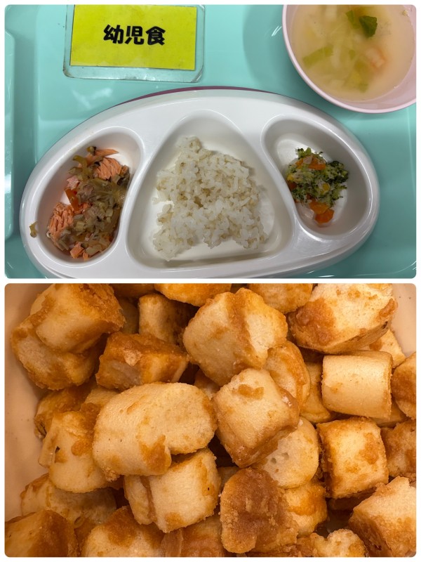 ご飯、鮭のホイル焼き、ブロッコリーサラダ、押し麦のスープ 15時のおやつ きな粉麩のラスク