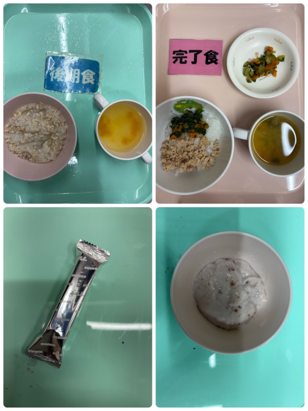 後期 鶏そぼろおじや、みそ汁 15時のおやつ ウエハース 完了食 三色そぼろ丼、きゅうりの塩昆布和え、みそ汁 15時のおやつ フルーチェ