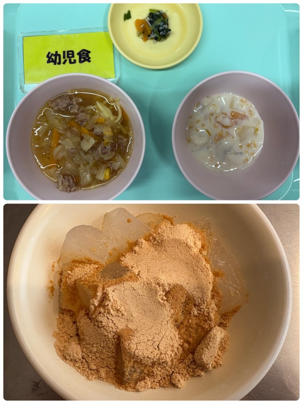 ちゃんぽんラーメン、ほうれん草のしらす和え、ヨーグルト和え 15時のおやつ わらびもち