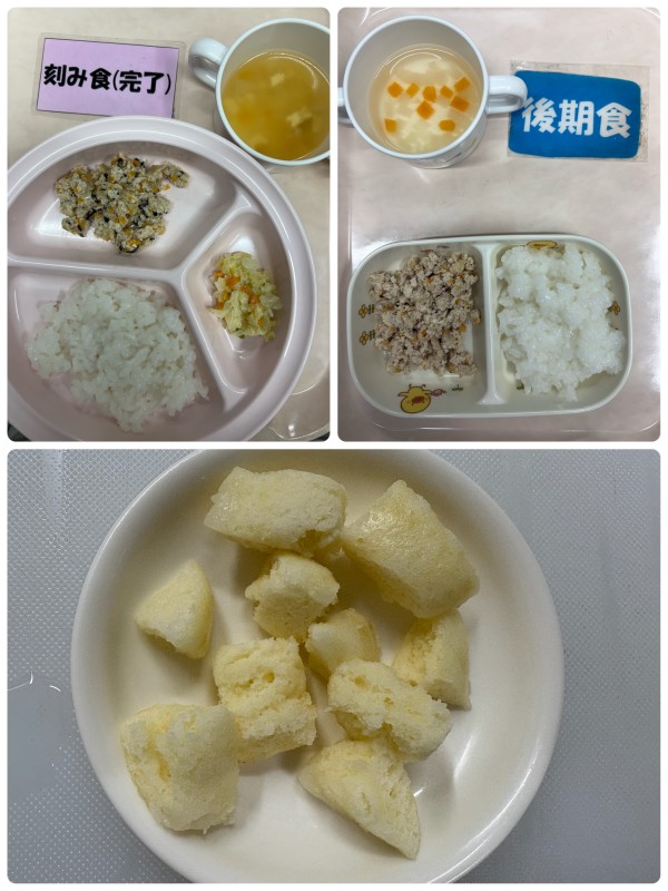 後期 5倍粥、豆腐ハンバーグ、みそ汁 完了食 軟飯、ミートローフ、コールスローサラダ、みそ汁 15時のおやつ 蒸しパン