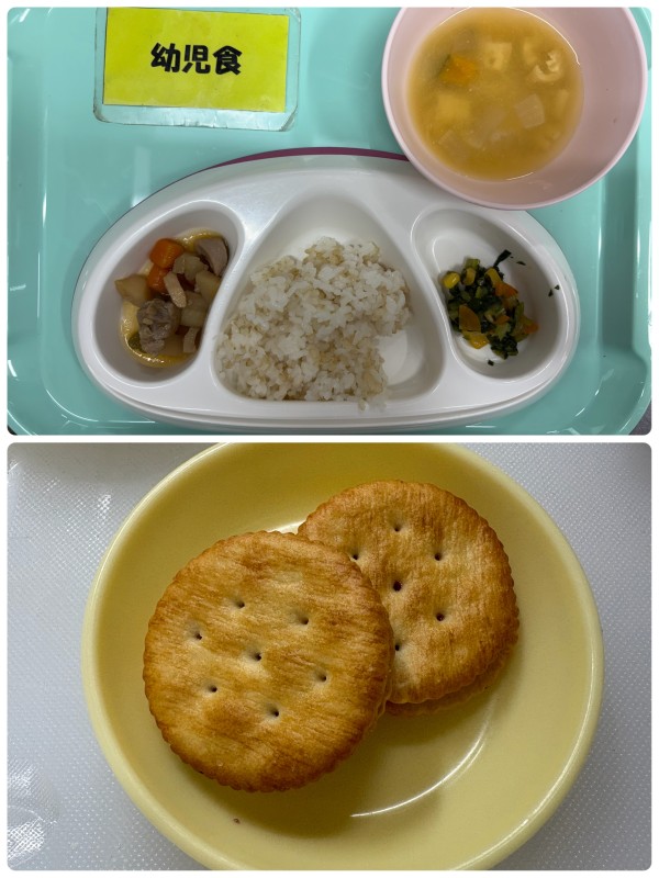 ご飯、鶏とれんこんの煮物、小松菜とコーンの和え物、みそ汁 15時のおやつ クラッカーサンド