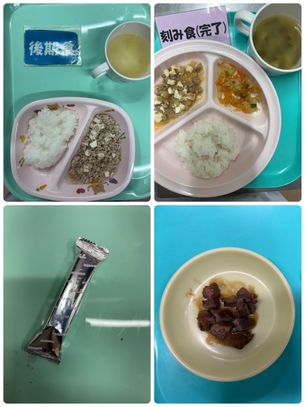後期 5倍粥、豚と豆腐のそぼろ煮、みそ汁 15時のおやつ ウエハース 完了食 軟飯、肉豆腐、いんげんのごま和え、みそ汁 15時のおやつ 鶏レバーの甘辛煮、ウエハース