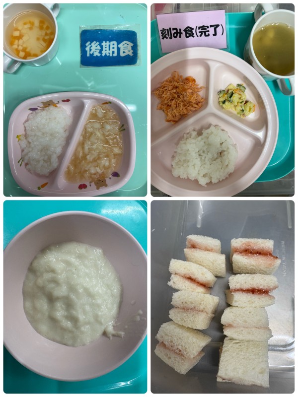 中期 5倍粥、白身魚の煮付け、みそ汁 15時のおやつ パン粥 完了食 軟飯、鮭の塩焼き、マカロニサラダ、みそ汁 15時のおやつ いちごジャムサンド🍓