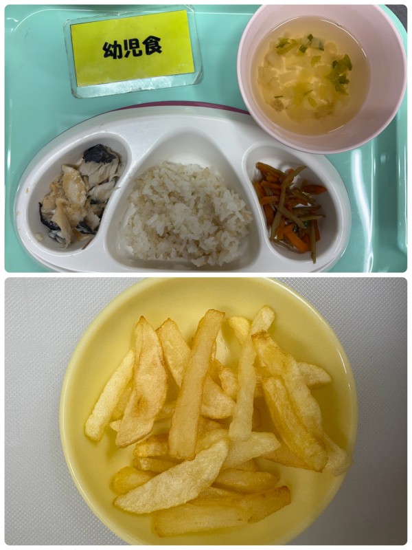 ご飯、さわららの味噌煮、きんぴらごぼう、すまし汁 15時のおやつ フライドポテト🍟