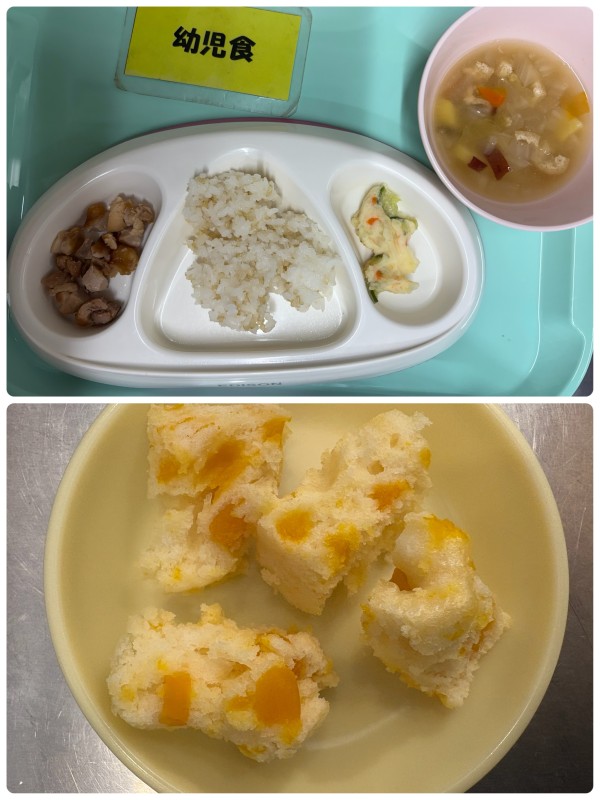 ご飯、鶏の照り焼き、ポテトサラダ、みそ汁 15時のおやつ かぼちゃ蒸しパン