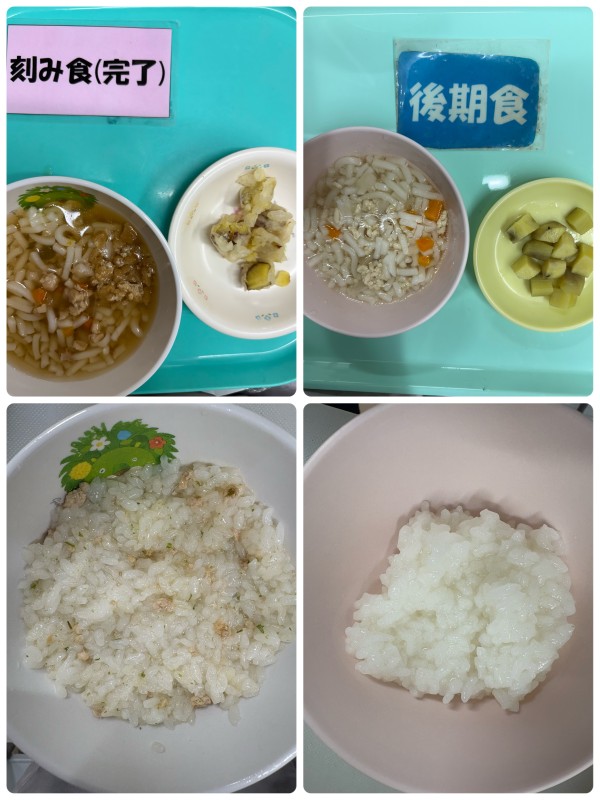 後期 鶏そぼろうどん、蒸しさつまいも 15時のおやつ 5倍粥 完了食 冷やしきつねうどん、さつまいもの天ぷら🍠 15時のおやつ おにぎり(鶏そぼろ)