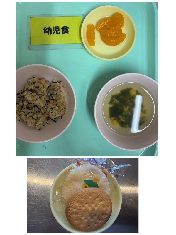 チャーハン、わかめスープ、みかん缶 15時のおやつ ぱりんこ、マリービスケット