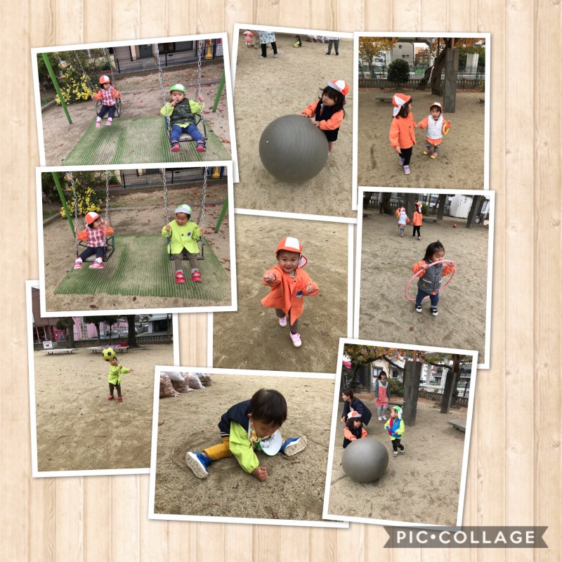 「まてまて〜!」と大きなバランスボールを追いかけたり、やわらかいサッカーボールを「いっせーのーで!」と高く投げて、ボール遊びを楽しみました。丸いバトンを持って、車のハンドルにして走っているお友だちや、腕にカバンのようにかけてお買い物に出かけて遊んでいるお友だちもいましたよ。