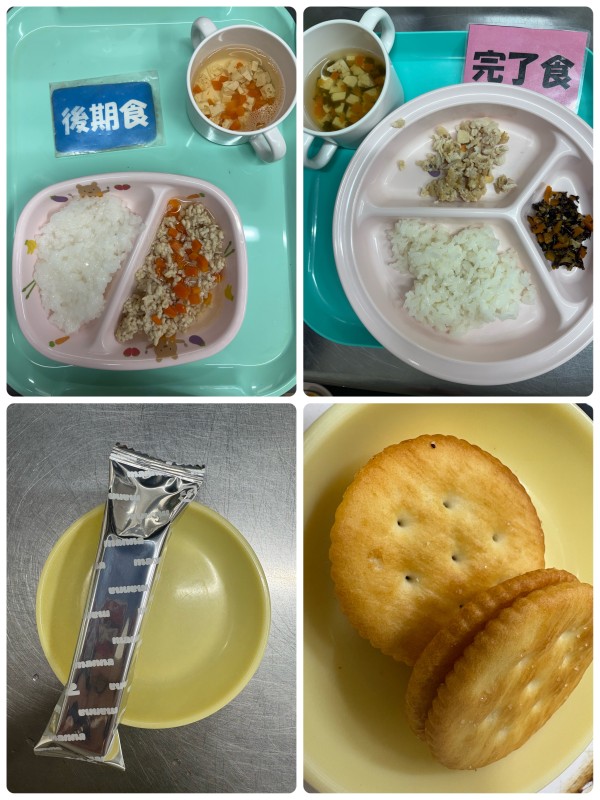 5倍粥、鶏そぼろ煮、豆腐すまし汁 15時のおやつ ウエハース ご飯、鶏のカレー焼き、ひじきの煮物、豆腐すまし汁 15時のおやつ クラッカーサンド