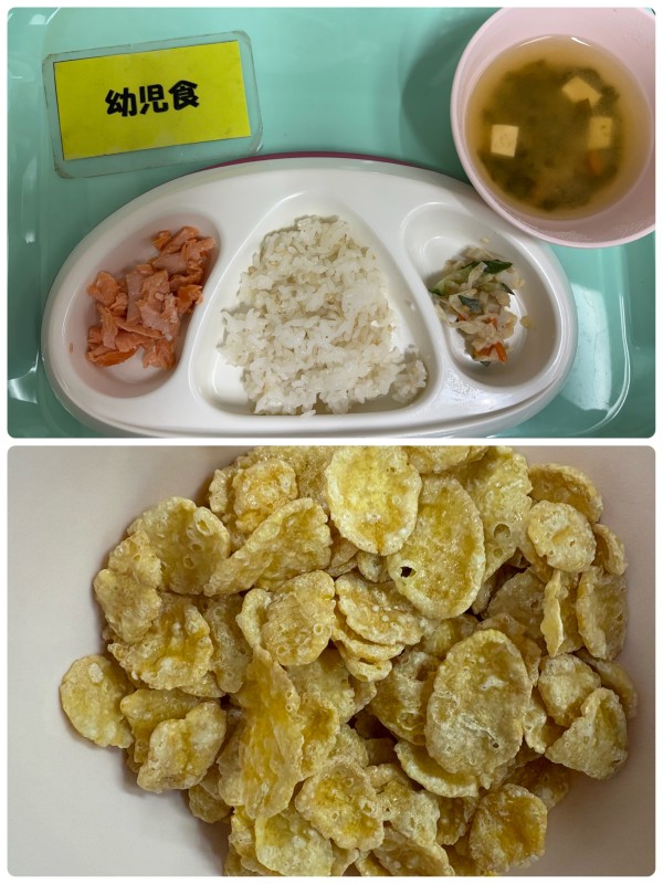 ご飯、鮭の塩焼き、切り干し大根のサラダ、みそ汁 15時のおやつ コーンフレーク