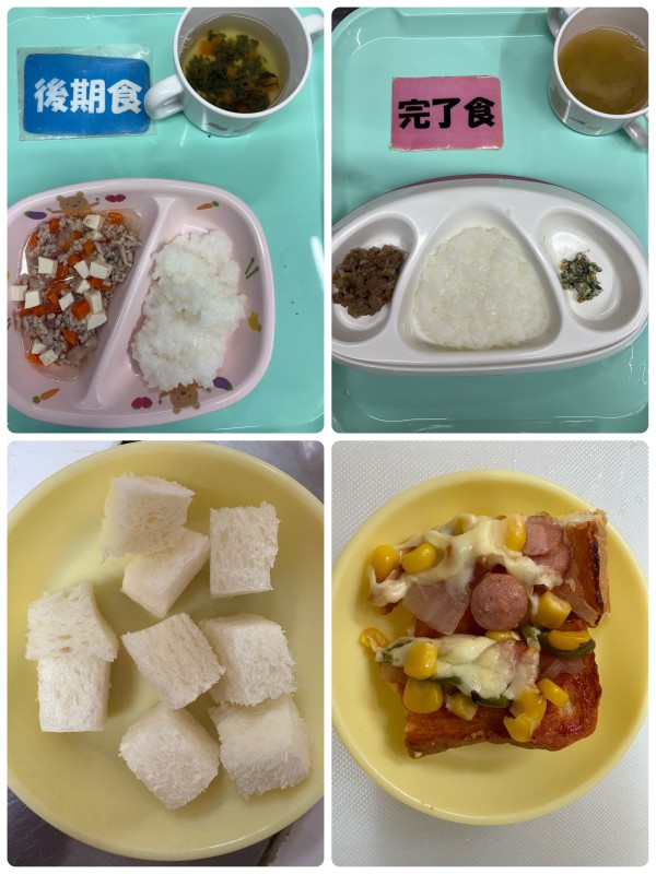 5倍粥、豚と野菜の煮物、みそ汁 15時のおやつ パン 軟飯/ご飯、牛肉とごぼうの煮物、白和え、みそ汁 15時のおやつ ピザトースト