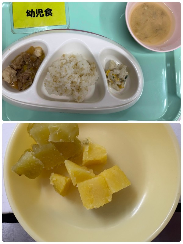 ご飯、豚肉のすき焼き風煮物、大根のツナ和え、みそ汁 15時のおやつ 焼き芋🍠